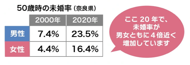 50歳時の未婚率 (奈良県) 50 歳現役世代の未婚化、 晩婚化の実態をさらに調査 し、課題解決に向け、国に法整備を求めていきます。 ここ 20 年で、未婚率が男女ともに4倍近く 増加しています